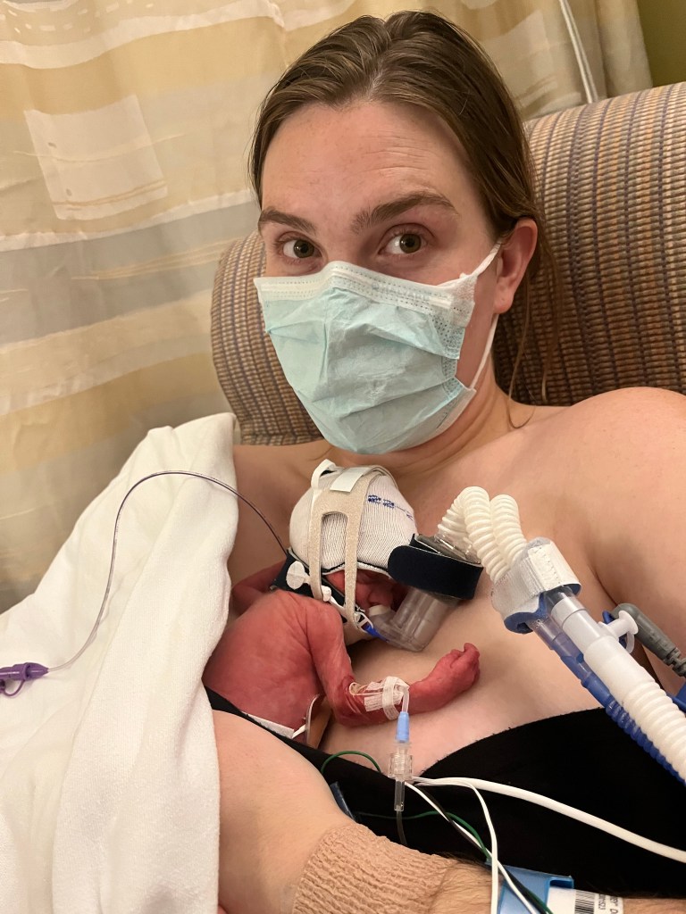 Our sweet girl, Bennie Wayne, was born on 7/26/22 at 853 am via emergency c-section. She was 28 weeks and 2 days GA. She was born with an unexpected cry at 1 lb 13 oz and 13 inches long. The NICU team and Joe got Bennie all set up and comfortable at the St Charles NICU while Audrey recovered.